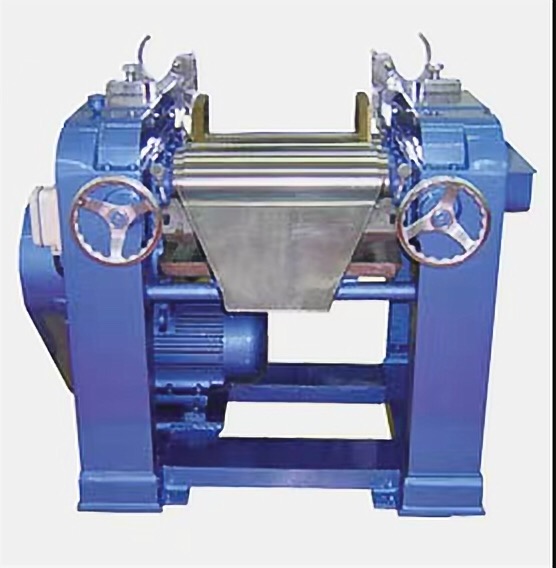 該設備由三個輥筒組成,裝在一個機架上,由電機直接帶動。一般輥筒間的轉動方向不同,前輥向前轉動,中輥向后轉動。輥子轉速前輥快、后輥慢。中間輥固定,前后兩輥裝在滑道上,有彈簧裝置,用手輪調節前后輥與中輥的距離。物料由后輥與中輥之間進入,受到輥筒的擠壓,產品顆粒變細,然后由快輥帶出,快輥末端裝有刮刀,使物料與輥筒分離,落入收集桶內。由于研磨過程產生大量熱量,各輥筒的中心是設計為空心結構,通水冷卻,保證產品質量。